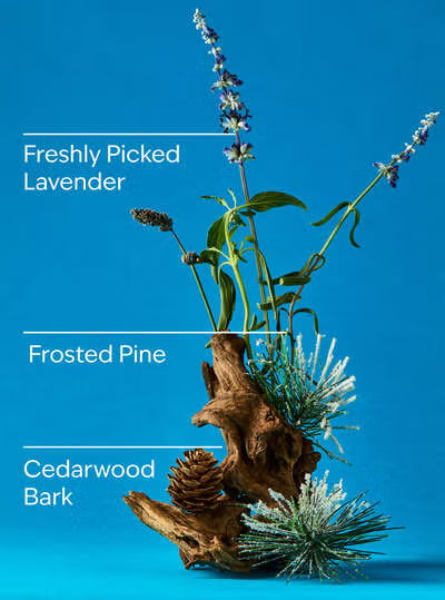 Свежесобранная лаванда, кора кедра и заиндевелая сосна.