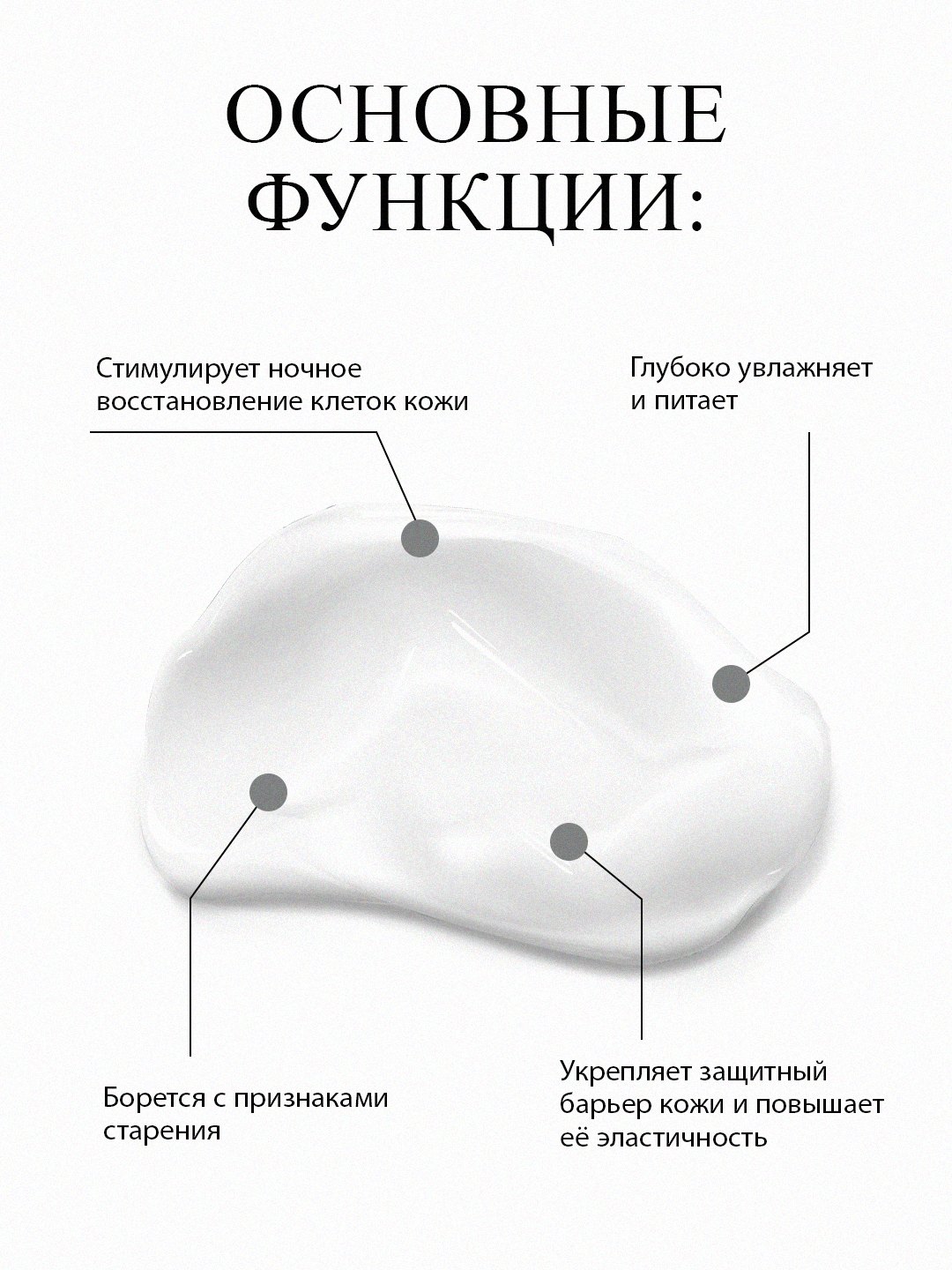 Ночной крем, который восстанавливает, питает и насыщает кожу влагой во время сна. Он стимулирует обновление клеток, устраняет признаки усталости, тусклости и стресса. Благодаря гиалуроновой кислоте, пептидам и растительным маслам крем глубоко питает, увлажняет и активизирует процессы восстановления кожи.