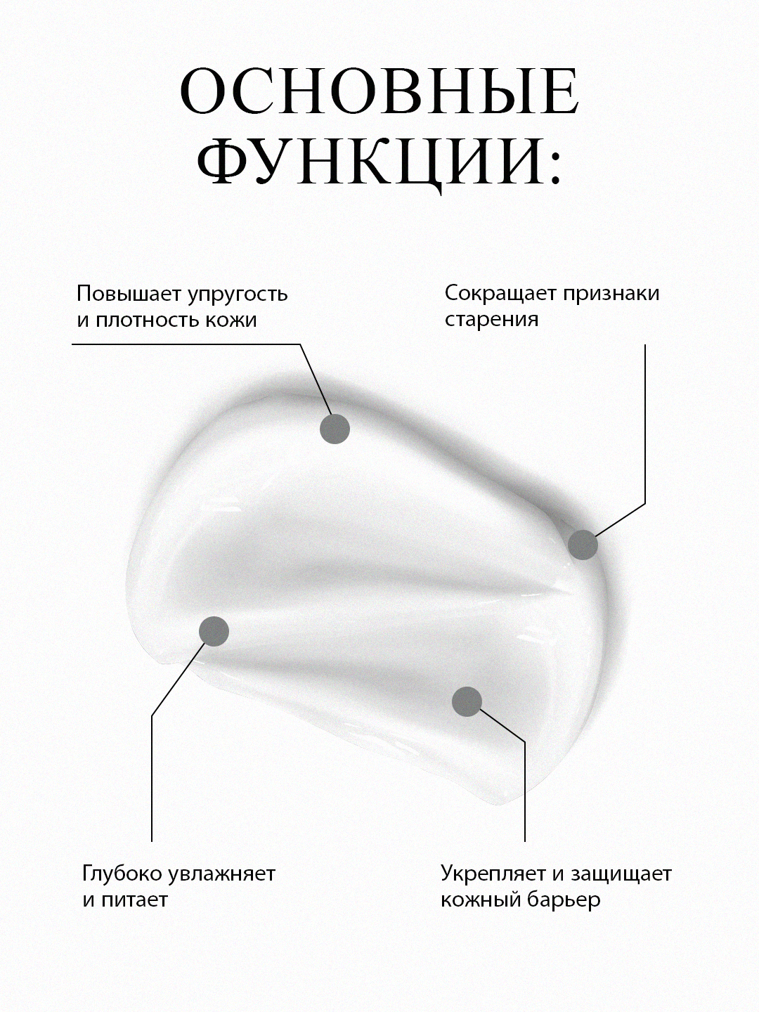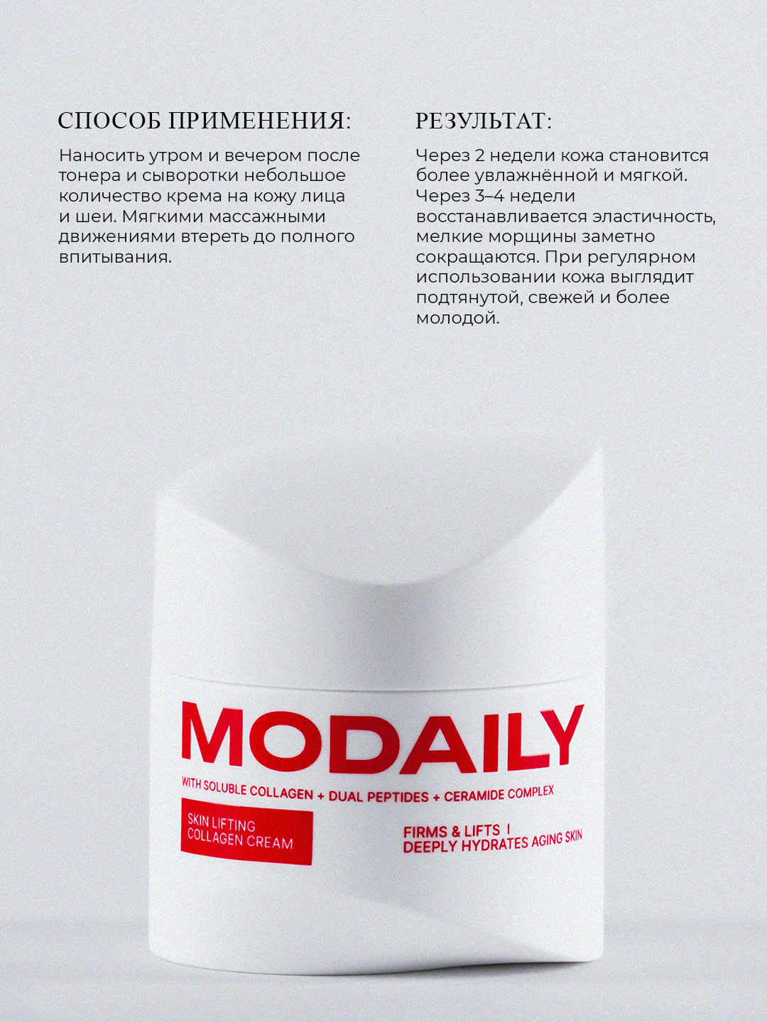 Комбинация коллагена, пептидов, гиалуроновой кислоты и церамидов восстанавливает эластичность кожи, укрепляет контуры лица и придаёт выраженный эффект «молодой кожи». Лёгкая текстура быстро впитывается, делая кожу подтянутой, гладкой и свежей.