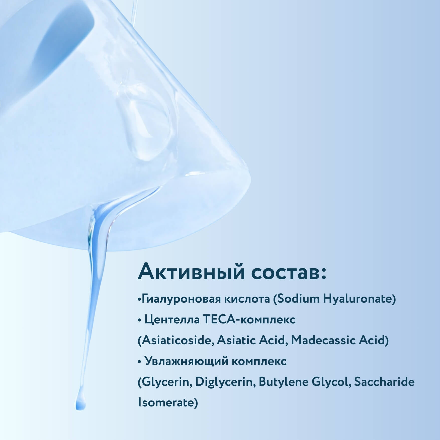 - Комплекс центеллы (Asiaticoside, Asiatic Acid, Madecassic Acid) — поддерживает комфорт кожи, помогает успокоить реактивность