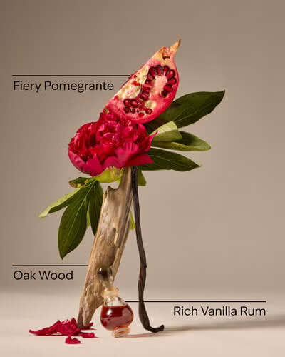 Огненный гранат, красный пион, насыщенный ванильный ром и дубовое дерево.