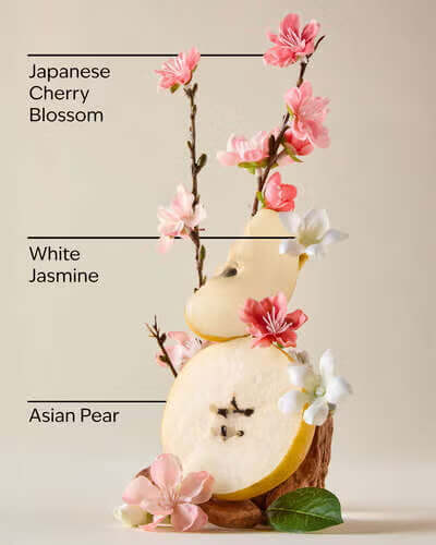 Японская вишня в цвету, азиатская груша, свежие лепестки мимозы, белый жасмин и румяное сандаловое дерево.