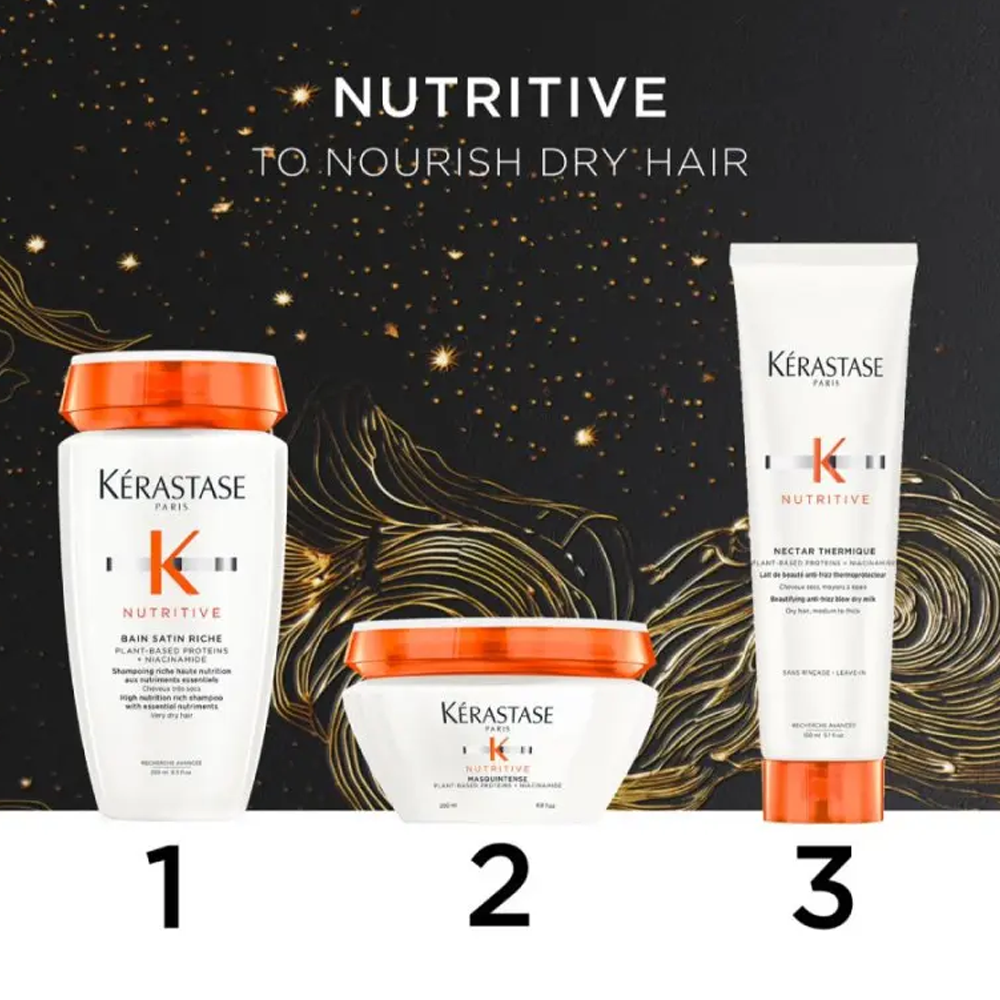 Профессиональный подарочный набор Kérastase Nutritive из 3 средств для интенсивного питания и увлажнения сухих волос. Набор помогает восстановить волосы по длине, защитить их от пересушивания и облегчить укладку. Идеально подходит для ежедневного ухода за сухими и ослабленными волосами.